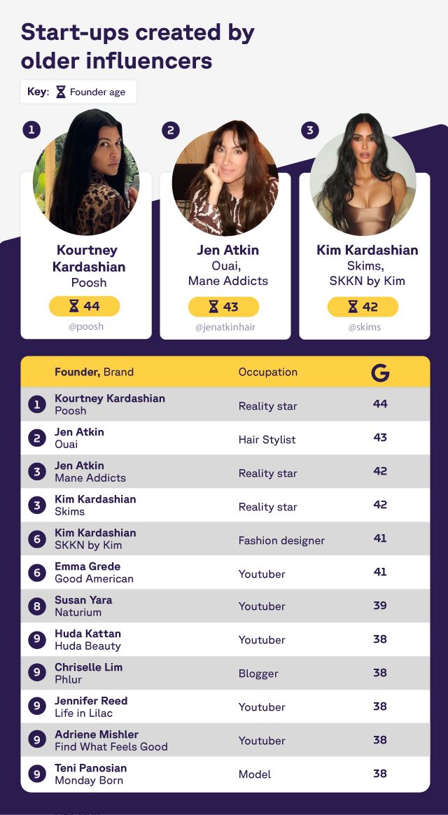 Reality star Kourtney Kardashian takes first place as the oldest influencer with a start-up on our list. In early 2019 Kourtney launched her website called Poosh which is described as a “modern guide to living your best life.”